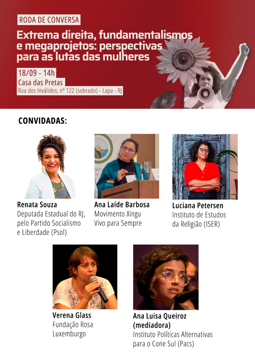 No próximo dia 18 de setembro, o Instituto Políticas Alternativas para o Cone Sul (Pacs), em parceria com a Fundação Rosa Luxemburgo e a Rede Nacional de Mulheres Guardiãs dos Territórios Ameaçados e Atingidos por Megaprojetos, realiza a roda de conversa “Extrema direita, fundamentalismos e megaprojetos: perspectivas para as lutas das mulheres”, evento que conta com o apoio de Fundo Sage, Fundação Ford, Misereor e Casa das Pretas. A atividade é gratuita e acontece a partir de 14h, na Casa das Pretas, no Rio de Janeiro (RJ) – Rua dos Inválidos, nº 122 (sobrado), Lapa. Para participar, basta inscrever-se através deste formulário.